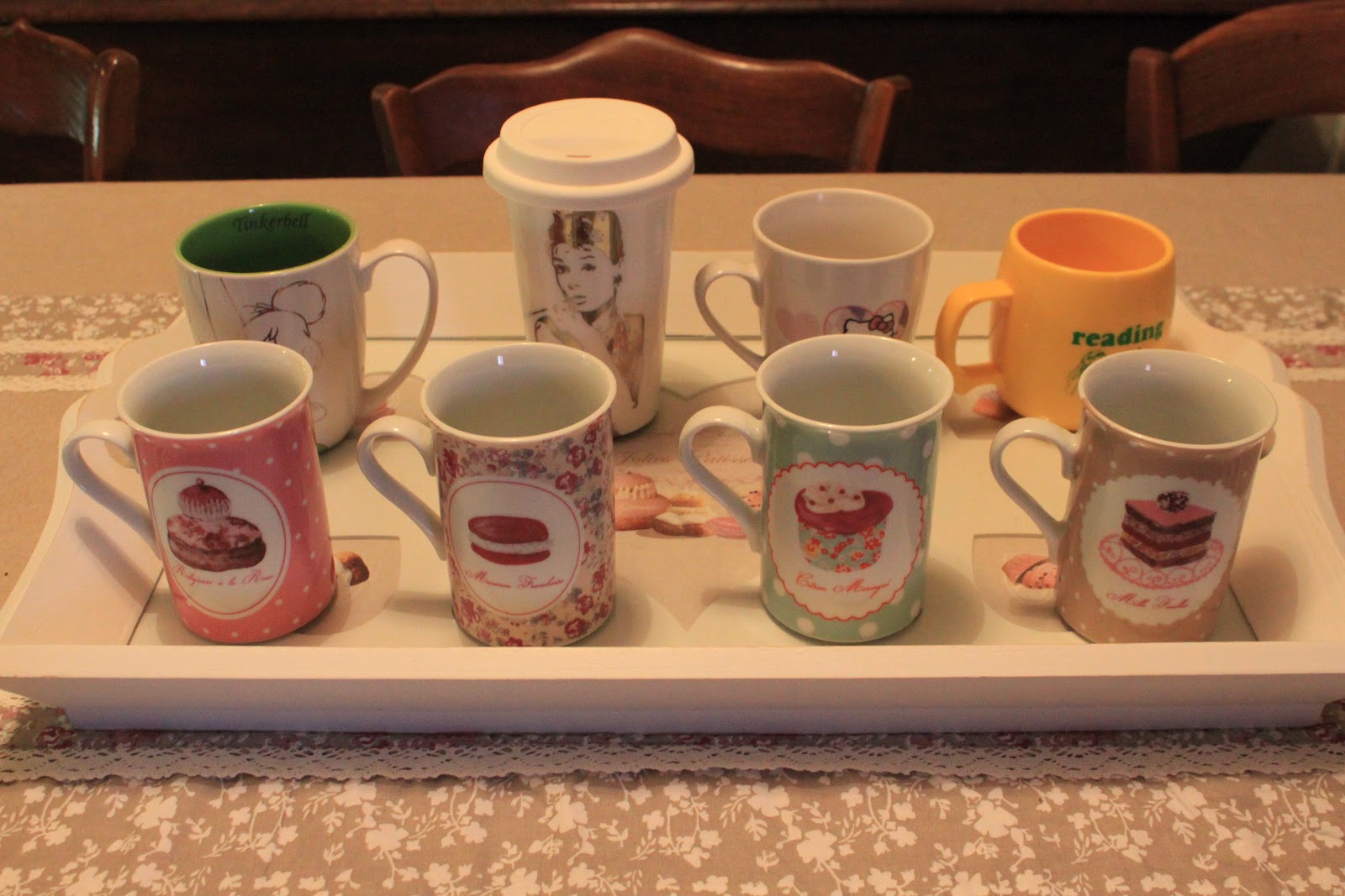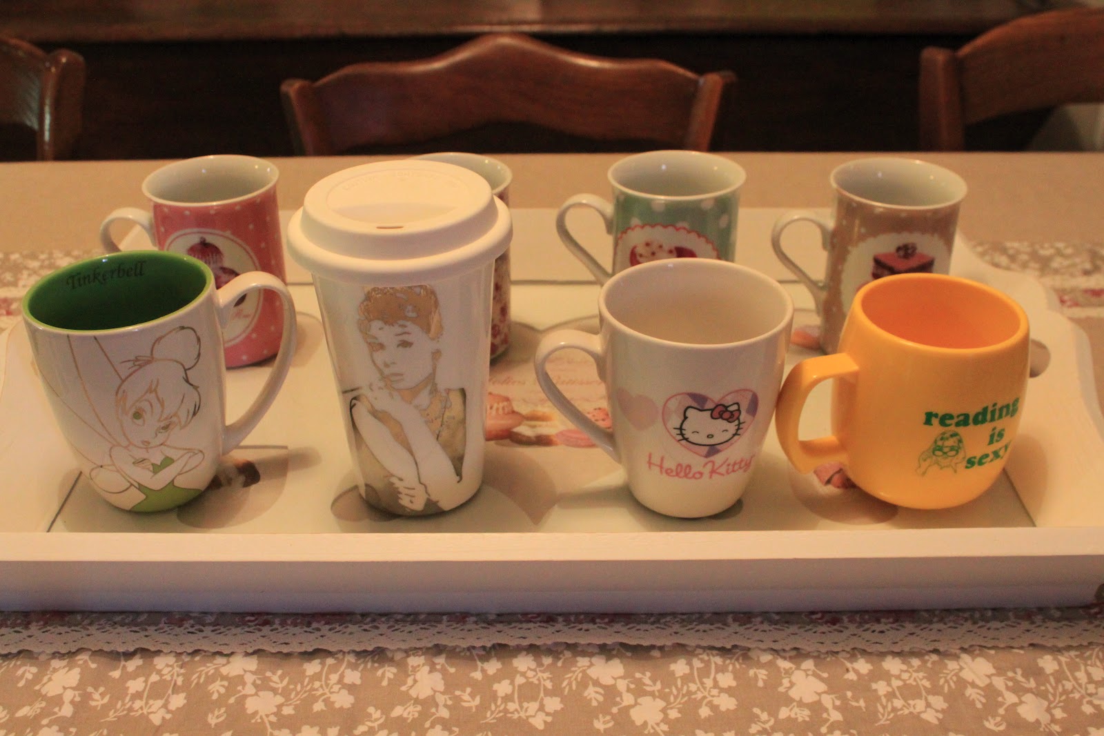 J'ai ma petit série, qui vient tout droit de la collection Poésie (Maison du monde), ma petite Fée Clochette qui arrive de Disney, "Reading is Sexy" en hommage au T-Shirt de Rory dans les Gilmore Girls, le mug père NoËl offert par ma "Coupine"à mon chéri, et surtout mon préféré le mug en Porcelaine imitation gobelet à Café Américain, avec son couvercle en silicone Audrey Hepburn, j'ai Galéré pour le trouver, je ne l'utilise même pas, j'ai trop peur de le casser et je ne suis pas certaine de pouvoir le retrouver!